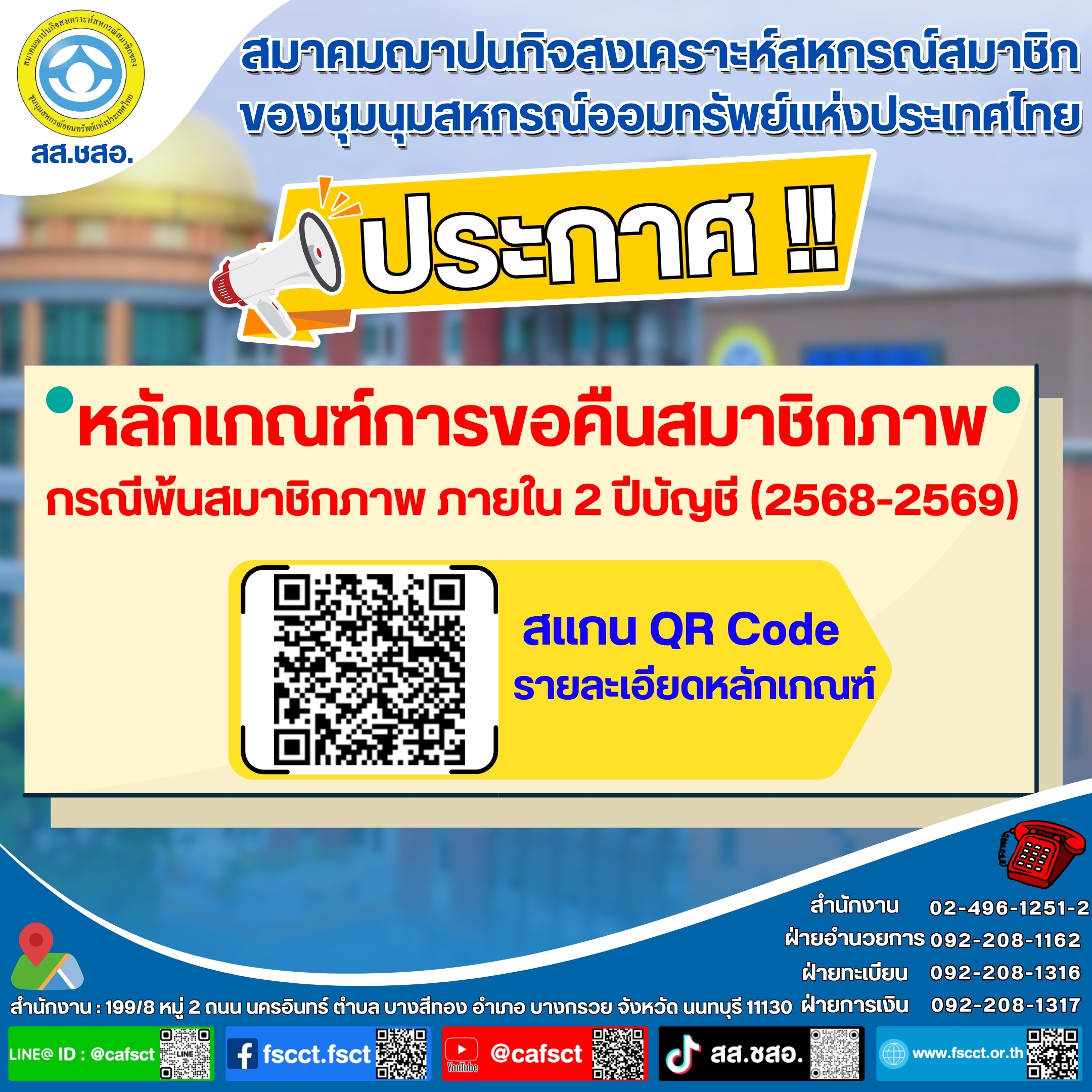 | ประกาศหลักเกณฑ์การขอคืนสมาชิกภาพ กรณี พ้นสมาชิกภาพ ภายใน 2 ปีบัญชี (ปี 2568 - 2569) ประกาศเมื่อวันพฤหัสบดีที่ 11 ธันวาคม พ.ศ.2568 |