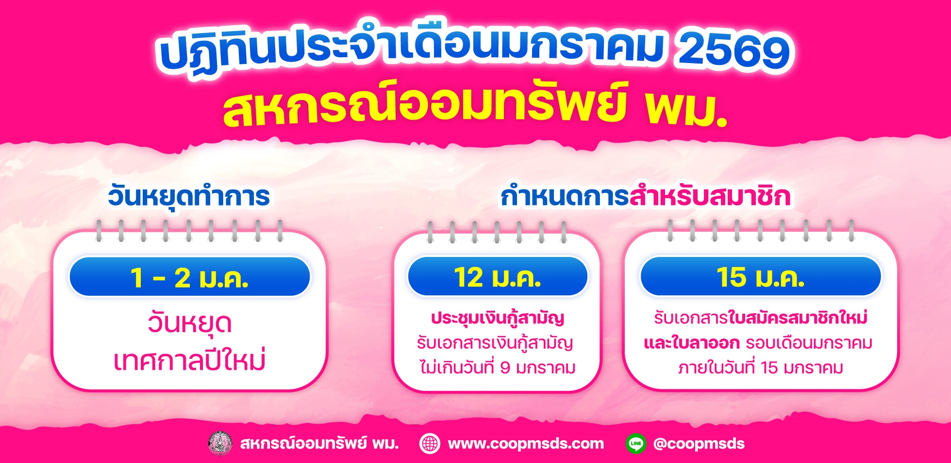 | ประกาศวันหยุดสหกรณ์ฯ พม. ปี2569 ประกาศเมื่อวันจันทร์ที่ 29 ธันวาคม พ.ศ.2568 |